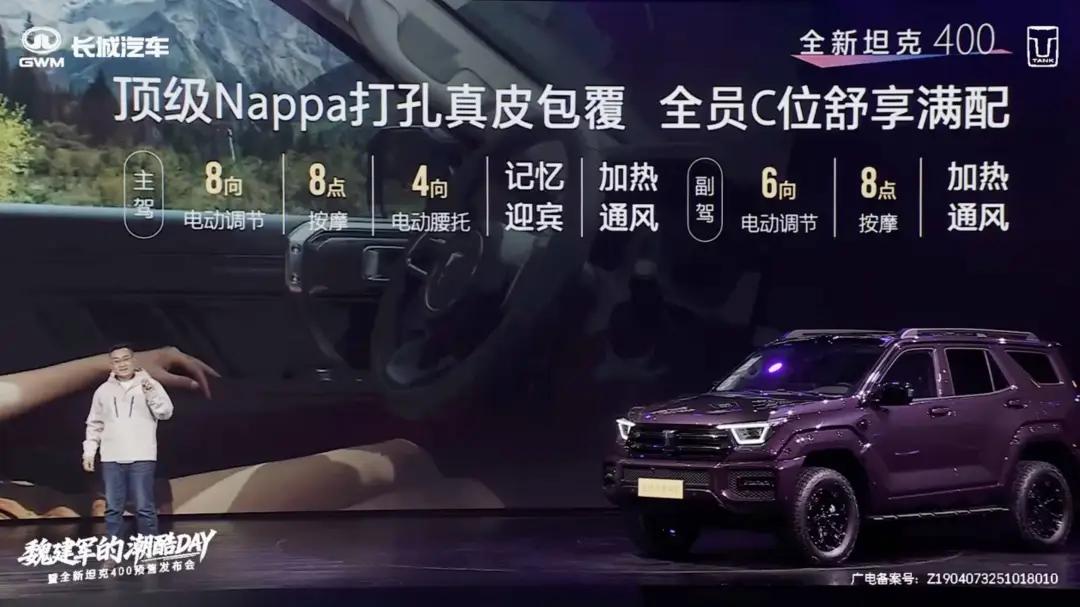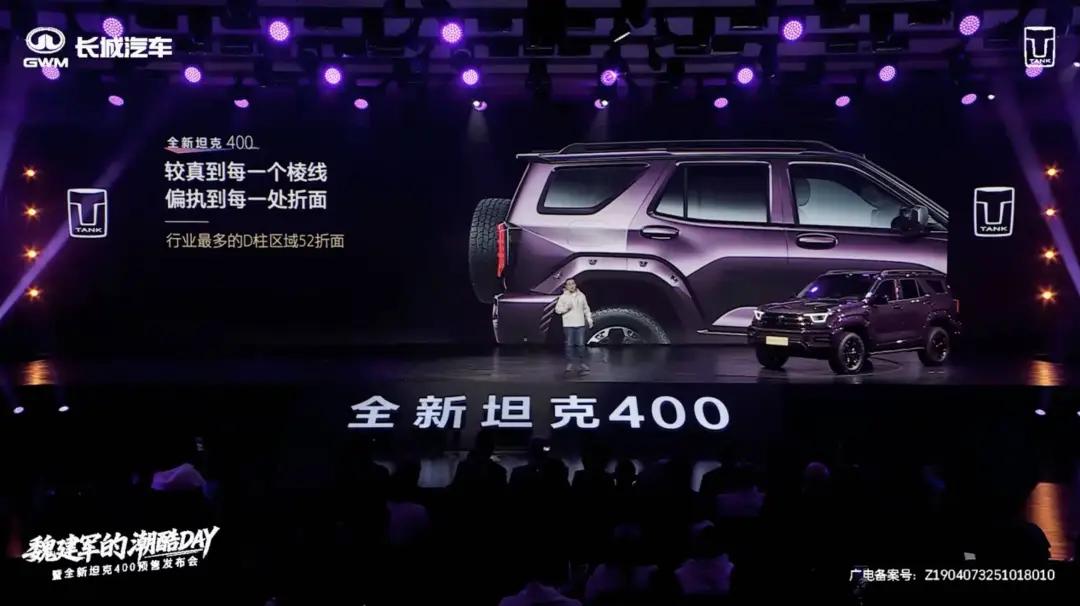 新款坦克400延续了标志性“星际机甲”外观,全车由超过700条直线、600多个折面及两万多处棱角构成,复杂造型对冲压、焊接等工艺提出了更高要求。外观改动集中在细节优化,前包围线条调整为更平直的样式,尾门备胎罩换成快拆结构,方便用户拆卸与改装。备受关注的“敦煌紫”车色成为主打,这种带有灰度与金属质感的暗紫色灵感源自敦煌壁画矿物颜料,通过8层喷涂与5微米级珠光粉打造,成本高于普通漆色却向用户免费开放选配。