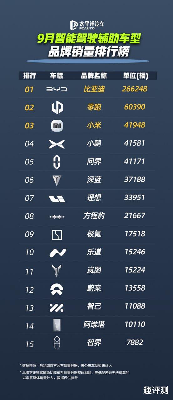 在太平洋汽车发布的9月智能驾驶辅助车型品牌销量榜中,比亚迪汽车荣登榜首,销量是第二名的4倍还多,优势断层领先。