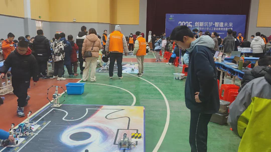九中选手在各个赛项中表现出色:在 ICode 赛项中,他们通过图形化编程、Python 和 C++ 语言,模拟宇航员 DEV 在星际穿越中的挑战,展现出顶尖的算法思维;中鸣超级轨迹赛中,机器人选手的精彩表现获得了评委会的特别评价;文明启航项目中,学生们巧妙融合传感器技术、AI 视觉识别与物联网应用,将课堂知识成功转化为解决现实问题的能力。