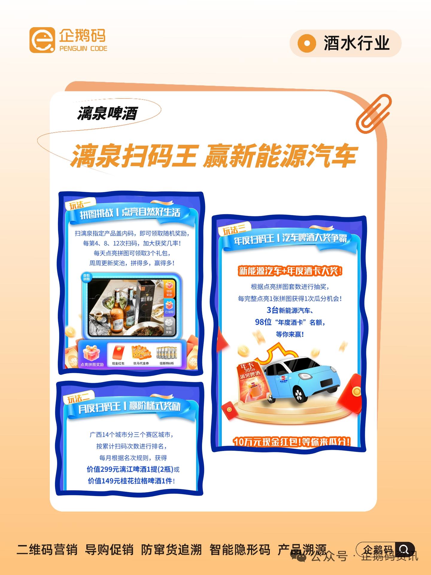 这种高价值奖品,自带 “传播体质”:有人扫到奖会发朋友圈,没扫到的也会跟朋友聊 “漓江啤酒扫码能抽汽车”,相当于帮品牌免费打广告。而且 “年度” 的周期够长,能让大家一整年喝啤酒时都记得这个活动,持续吸引关注。