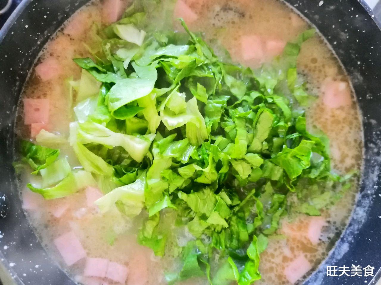 最后,生菜叶轻轻飘入锅中,不需要太长时间,只要半分钟,就足够了。生菜叶不仅为这碗粥增色不少,还让粥汤更加清新。