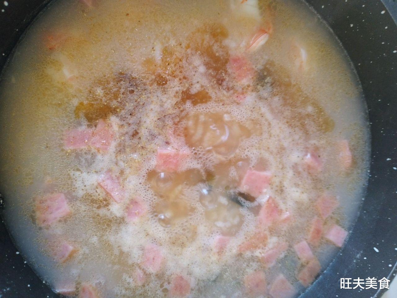 煮好的粥中,皮蛋丁、虾仁、火腿丁迅速加入,它们与粥交汇,瞬间焕发生机。虾仁们逐渐变色,释放着诱人的鲜香。