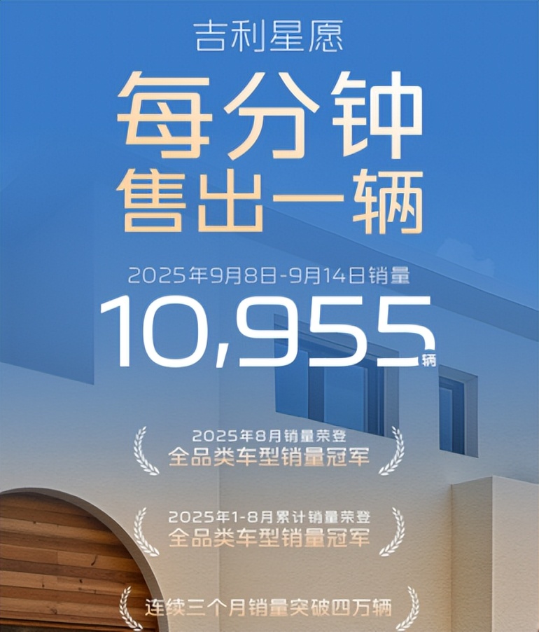 2025年车市厮杀正酣,吉利星愿却以强势销量持续领跑。9月8日-9月14日,单周销量高达10955辆,平均每分钟就有一辆成交,更拿下2025年8月全品类销冠,这款6.58万起(置换+国补)的纯电车型,凭“互联便捷+补能省心”的硬核组合,成了消费者的心头好。