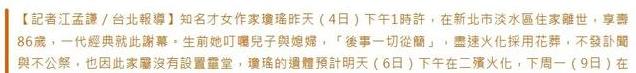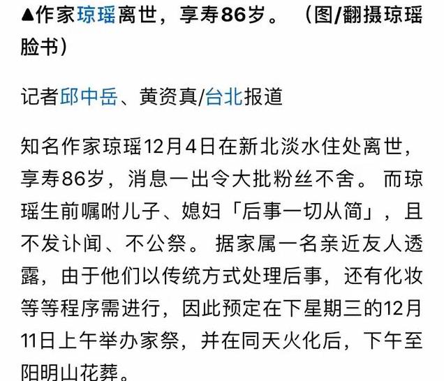 而之前据台湾媒体报道,琼瑶将会在12月6日下午火化,12月9日在阳明山举行花葬