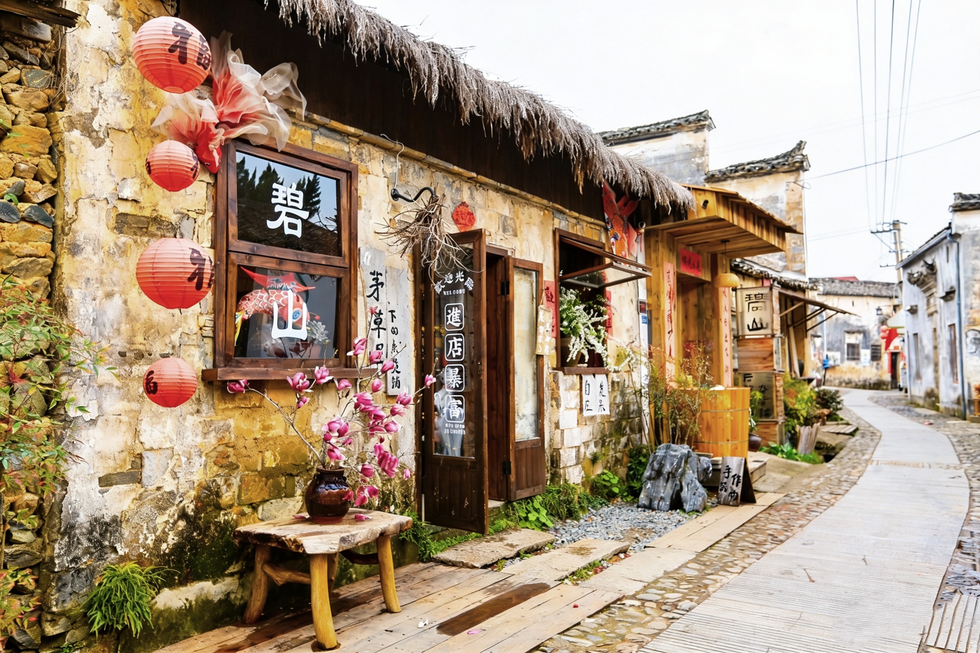走过小吃店,便有食物的香气尾随,经过咖啡馆,便有咖啡的味道氤氲。斑驳的墙壁前盛开着春花,茅草覆顶,青苔爬上墙角,碧山的神韵就藏匿在这些不起眼的细节里。