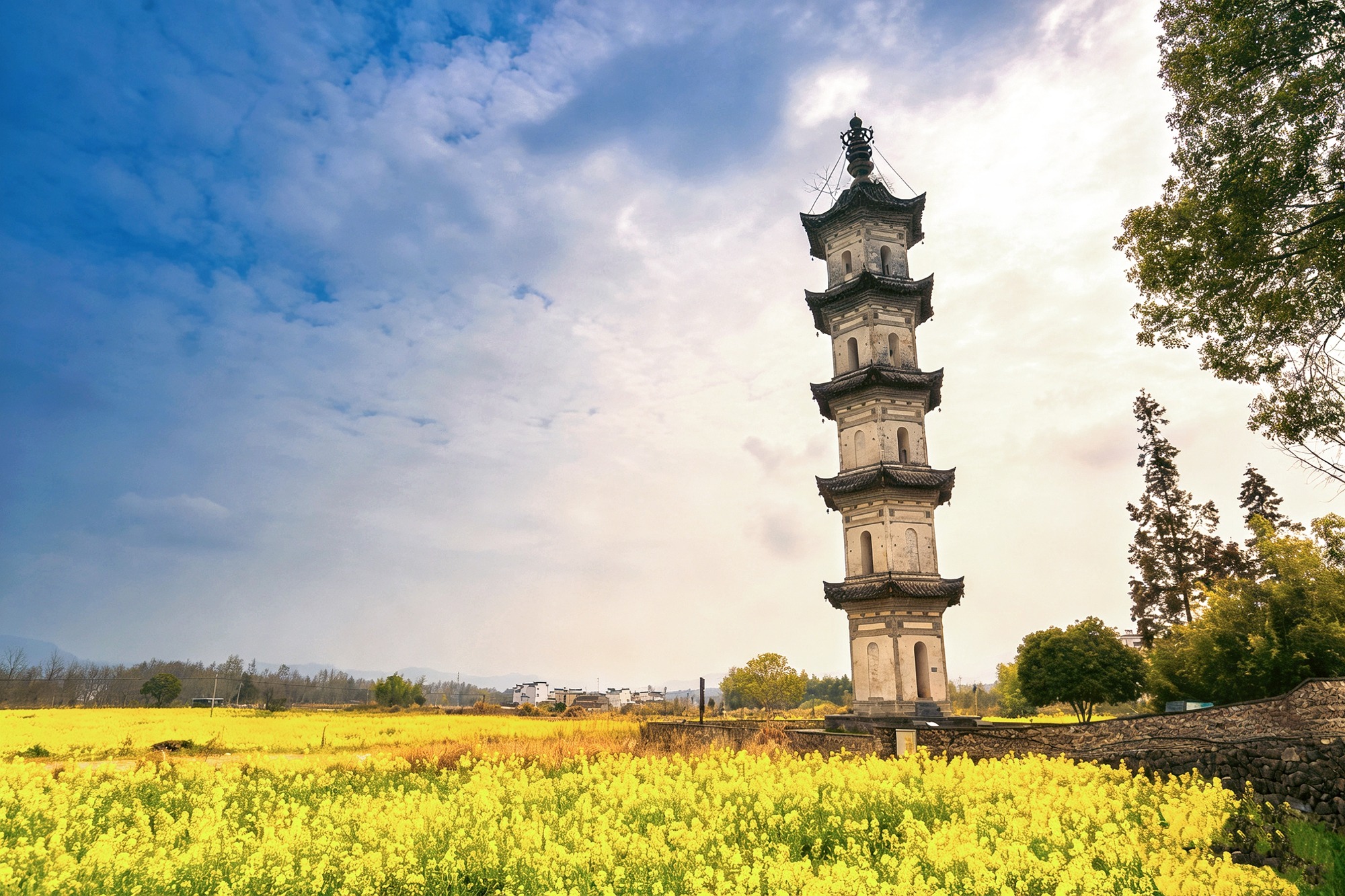 云门塔伫立在黄灿灿的油菜花田中,这座始建于宋代的塔就像宋时美人,纤细秀美,亭亭玉立,默默记下了属于碧山村的历史传奇和山水诗意。