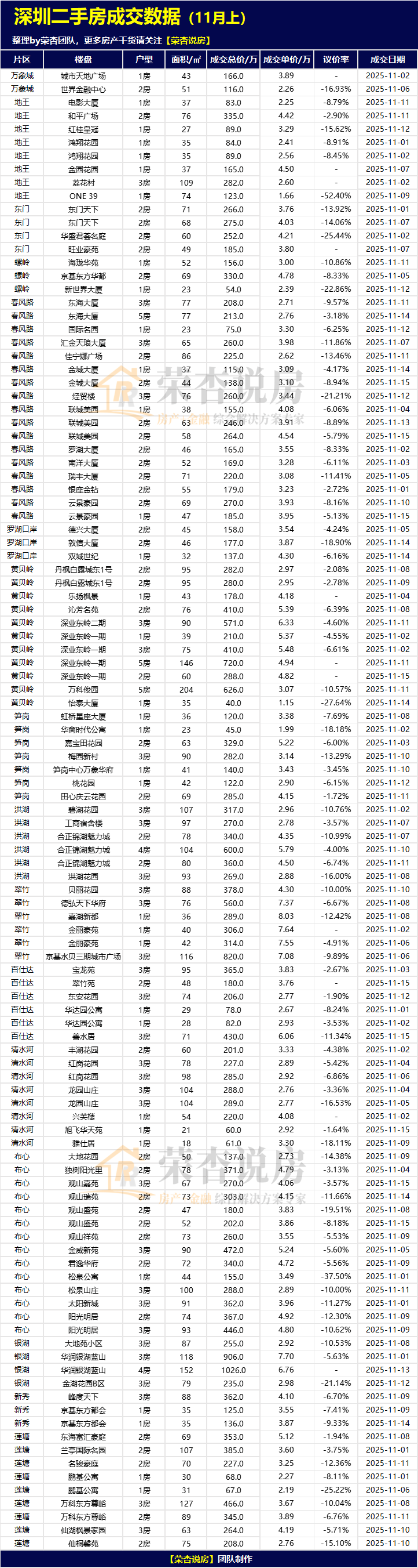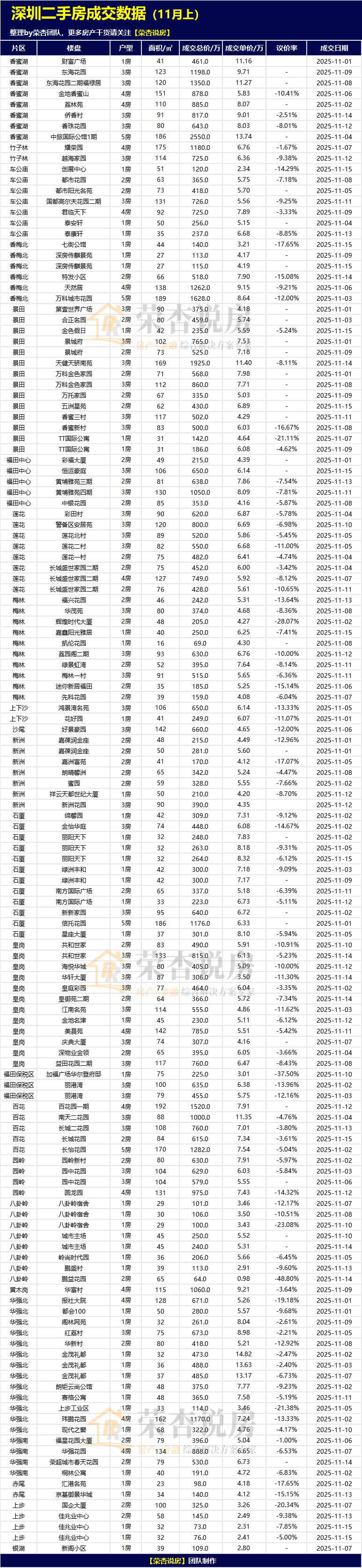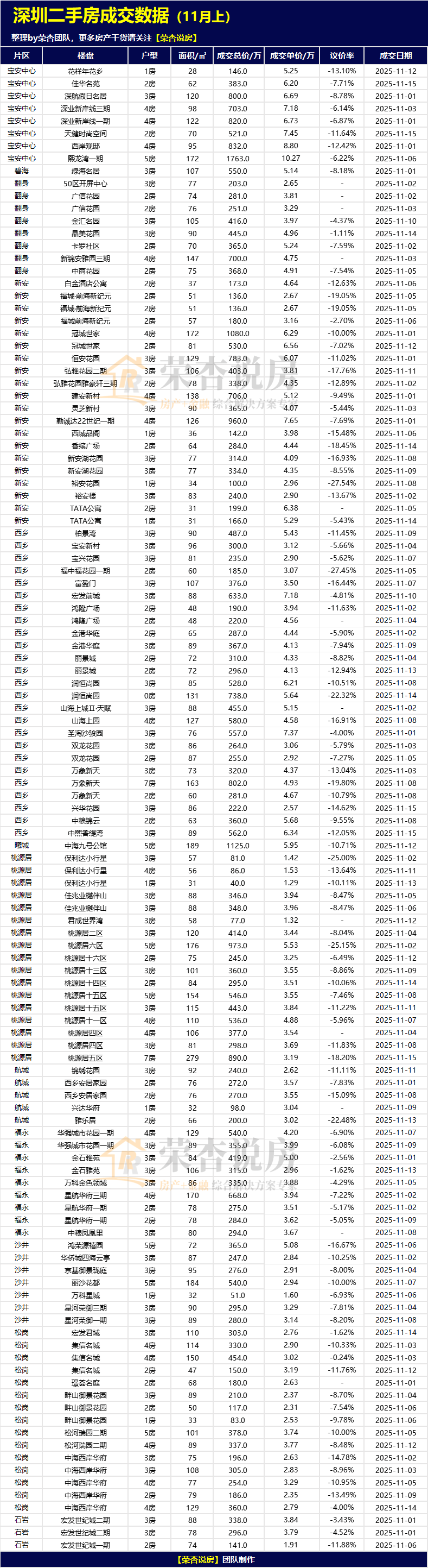 【荣杏说房】会定期发布近半月深圳二手房真实成交数据,如本次统计周期为:2025/11/01~2025/11/15