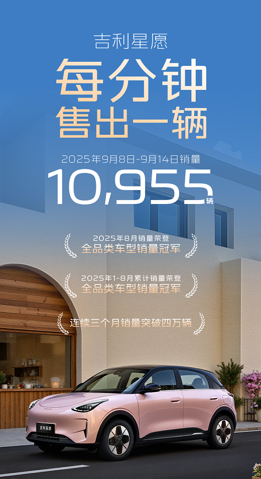 2025年8月,吉利星愿以单月48011辆的销量成绩登顶全品类车型销冠,9月第二周(9月8日-14日),星愿又以10955辆的成绩拿下周销冠。这款4.1米长的A0级小车用数据证明,其热销并非偶然。