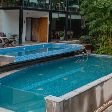 蕨屋一共有三个区域,一个是用两栋老房子改造的,一个是用石块围起来的。整个建筑的风格是欧式的,但却在无形中融合了江南特有的味道,每一个细节都体现出了这个地方独有的精致。比如,他们有一个很有外国风格的室外温泉;里面有一个巨大的游泳池,一个了望台,一个草地。无论你是一个人,还是一个团队,都可以在里面找到自己想要的东西。