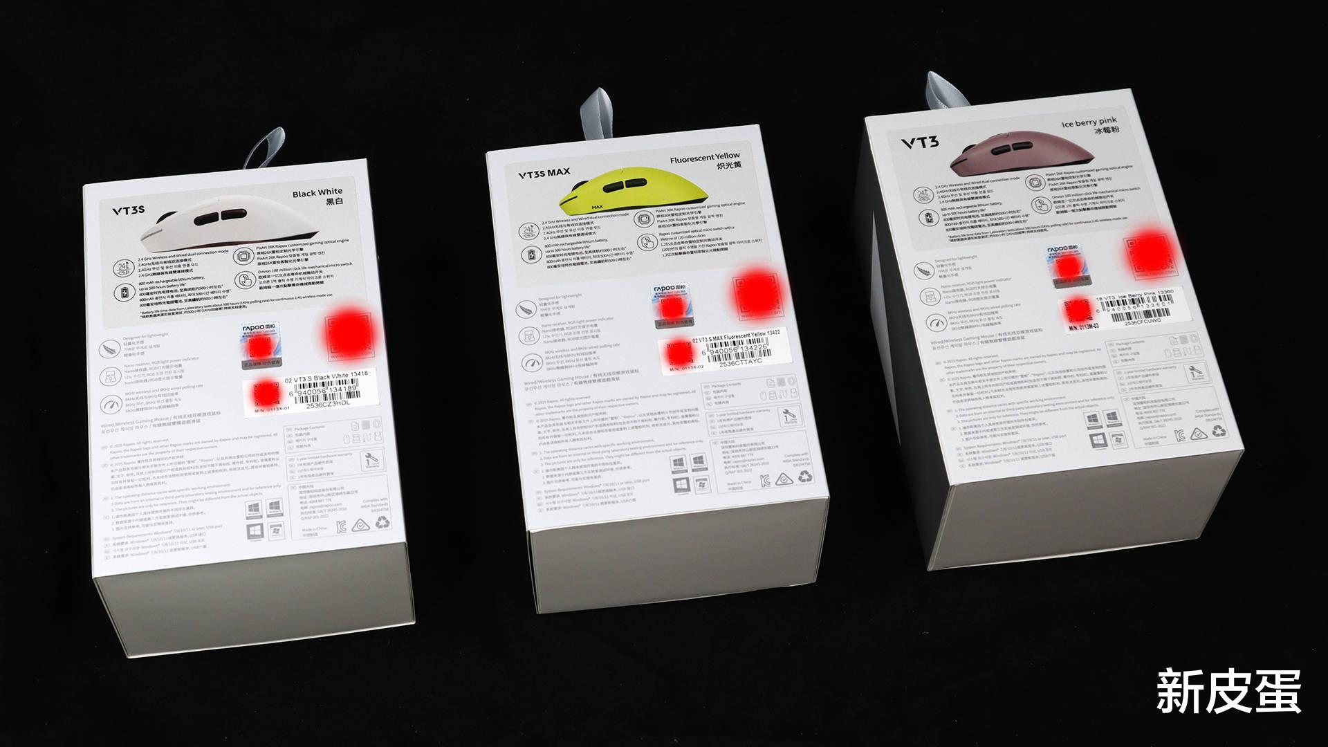 这次入手的是均是雷柏家VT系列的二代鼠标,主要为VT3系列以及VT3s系列两种,在下图中从左到右依次为VT3(冰梅粉)、VT3s(黑白)以及VT3s MAX(炽光黄)等三款鼠标。