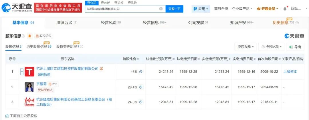 杭州娃哈哈集团有限公司成立于1993年2月,注册资本约5.26亿人民币,由杭州上城区文商旅投资控股集团有限公司(持股46%)、宗馥莉(持股29.4%)、杭州娃哈哈集团有限公司基层工会联合委员会(职工持股会,持股24.6%)共同持股。
