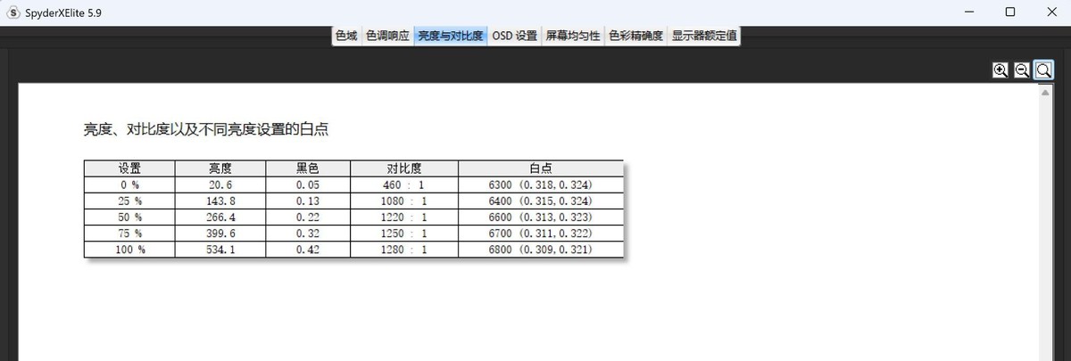 最后就是亮度均匀性和对比度测试,在不同亮度设置下(0%到100%),华硕ProArt创艺能够保持相对稳定的色温表现,白点坐标基本维持在6300K-6800K的范围内,色度坐标变化幅度也控制在合理范围。对比度数据显示,从460:1到1280:1的表现完全可以覆盖大多数专业应用的需求。