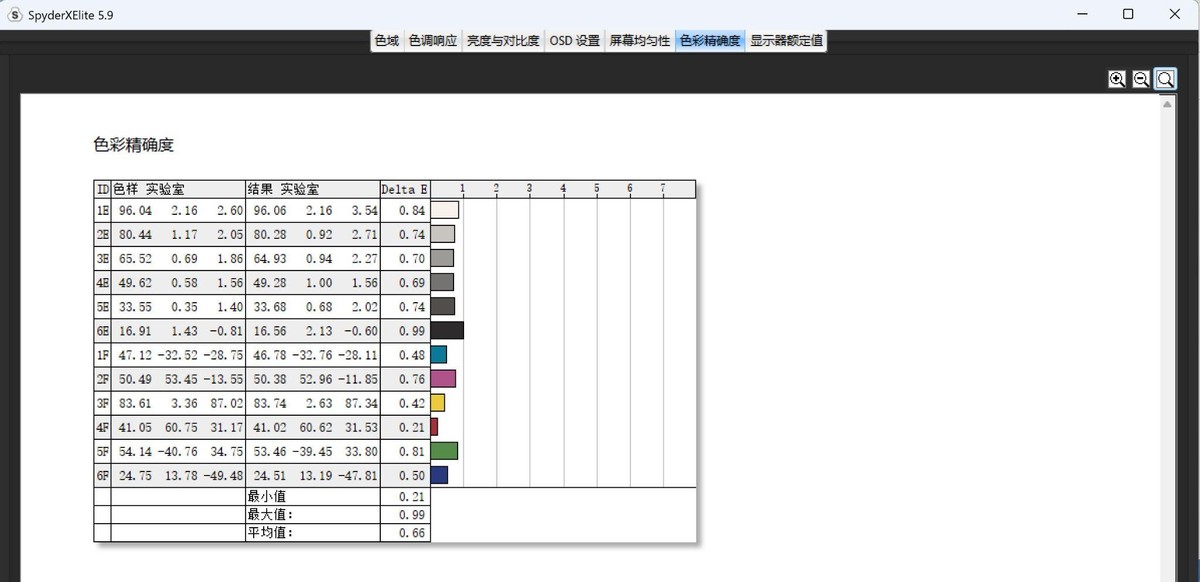 首先是色准,华硕ProArt创梦 5K艺不仅经过出厂校色,而且通过了Calman认证,色准方面是最不需要担心的。在我的实际测试中,所有色块的ΔE值都控制在1.0以下,最小ΔE值达到了0.21,最大值为0.99,平均值为0.66,这样的表现完全符合专业图像处理和色彩管理的严格要求。