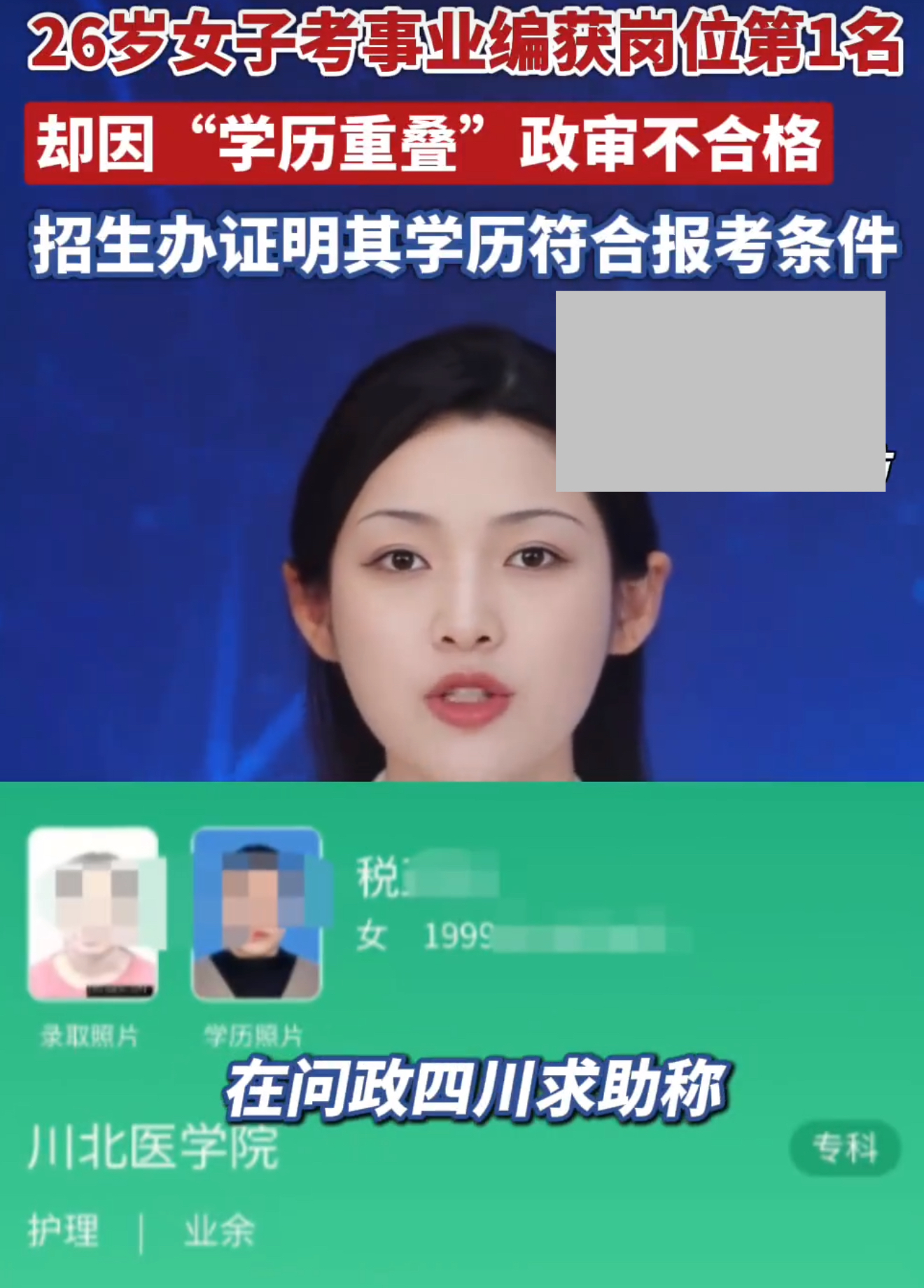 护理专业,2016年到2019年学习拿到的毕业证。笔试面试的时候,学历材料都审核通过了,谁能想到政审出了岔子。射洪市卫健局觉得这是“学历套读”,属于违规。可税女士有学校证明,说当时政策许可,她中专期间参加成人高考合格后,才去川北医学院参加大专班业余学习,成绩合格毕业的。射洪市教育招生考试委员会办公室也证明她符合当年报考条件。