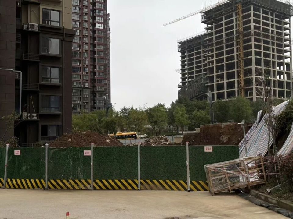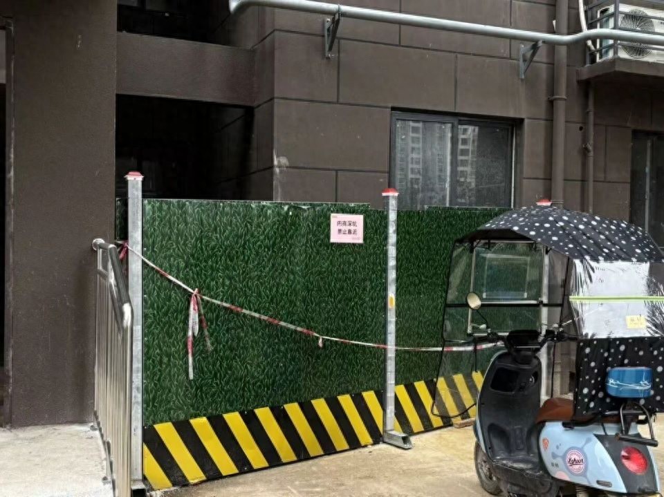 10月11日的西安,已经连续下了一个月的雨,阴冷潮湿得恍如南方。位于西安南郊的航天新佳园二期小区里,随处可见约两米高的绿色铁皮围挡,上面贴着许多A4大小、印有“请勿靠近”的红色警示纸。小区里几乎没有绿植,只有杂草在土堆上疯长。道路凹凸不平,形成一滩又一滩的泥水,行人避之不及。从小区北门往西走到28号楼单元门西侧,会看到被黄色铁板封住的一片区域,边上有一些垃圾,外侧也拉起绿色围挡,上面贴着印有“内有深坑,请勿靠近”的警示纸。如果观察细致一些,还会注意到通往地下车库的所有楼梯门都被木板或铁钉封住,电梯的负一到负三层按键按不亮。
