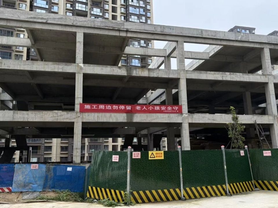 一栋烂尾楼上拉着横幅:施工周边勿停留,老人小孩安全守(曹年润 摄)