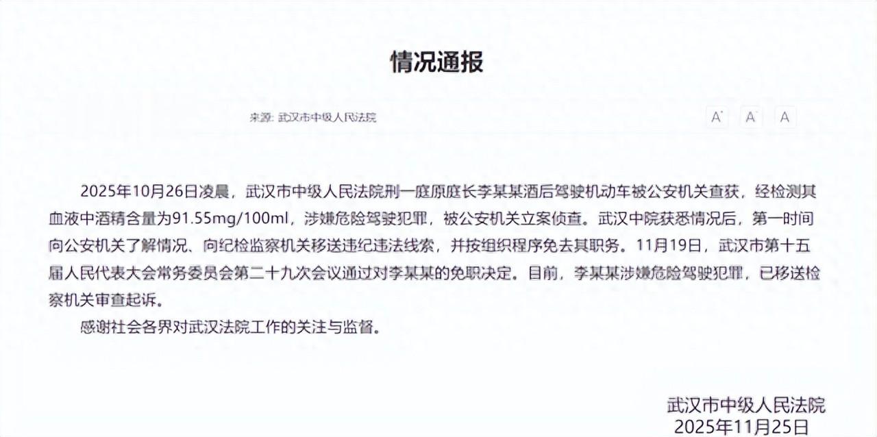 据武汉市中级人民法院网站消息,武汉市中级人民法院11月25日发布情况通报, 2025年10月26日凌晨,武汉市中级人民法院刑一庭原庭长李某某酒后驾驶机动车被公安机关查获,经检测其血液中酒精含量为91.55mg/100ml,涉嫌危险驾驶犯罪,被公安机关立案侦查。