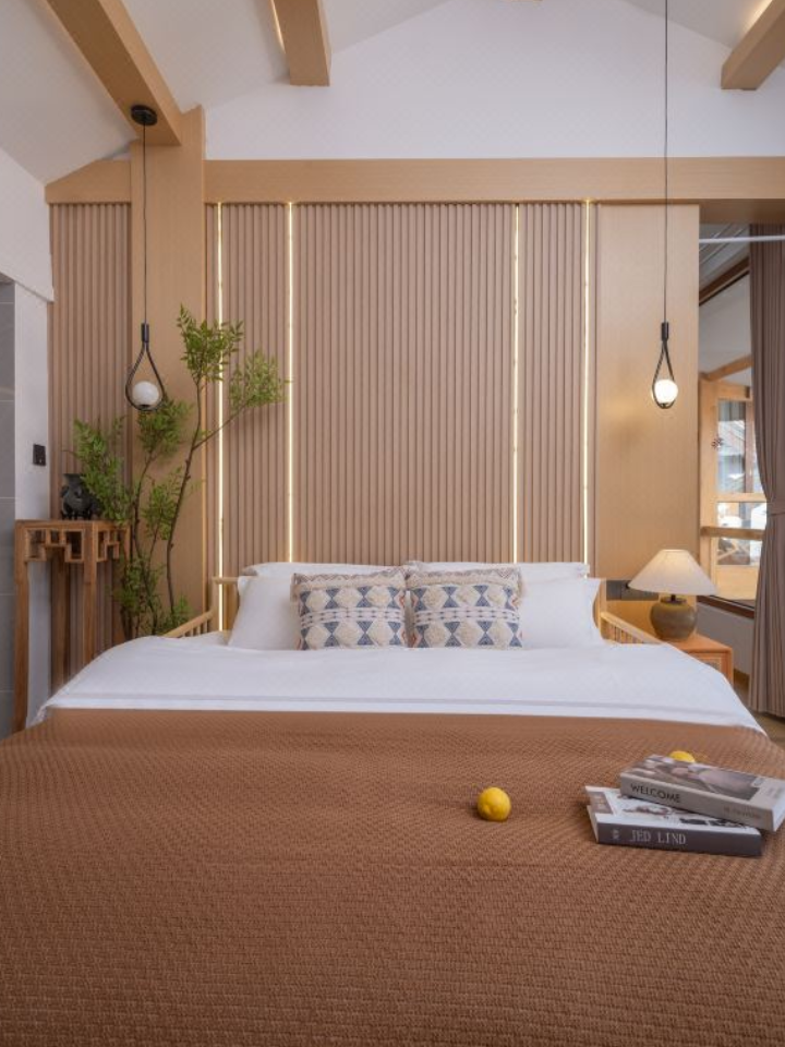 每间木屋别墅均有观景阳台,在房间便能感受湖光山色。部分房型配置家庭养生露天私泉,让您保有私密性的同时享有温泉体验。