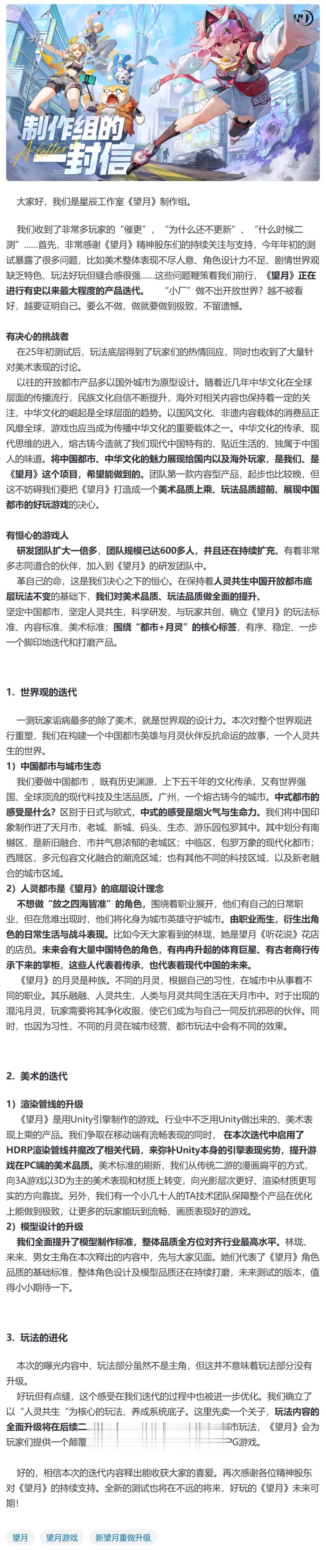 更让人意外的是,这种精致感并非来自引擎更换。官方公开信显示,项目组并未更换Unity引擎,而是对其进行了底层重构,充分释放渲染潜力,并且还有「小几十人的TA技术团队」保证产品优化。