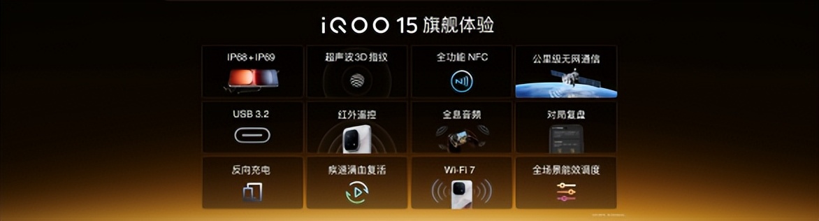 全面无短板,iQOO 15 搭载全新一代超声波 3D 指纹、IP68IP69 防尘防水、Wi-Fi7、全功能 NFC、UWB车钥匙、公里级无网通信和红外遥控等,一步到位,全部顶满。
