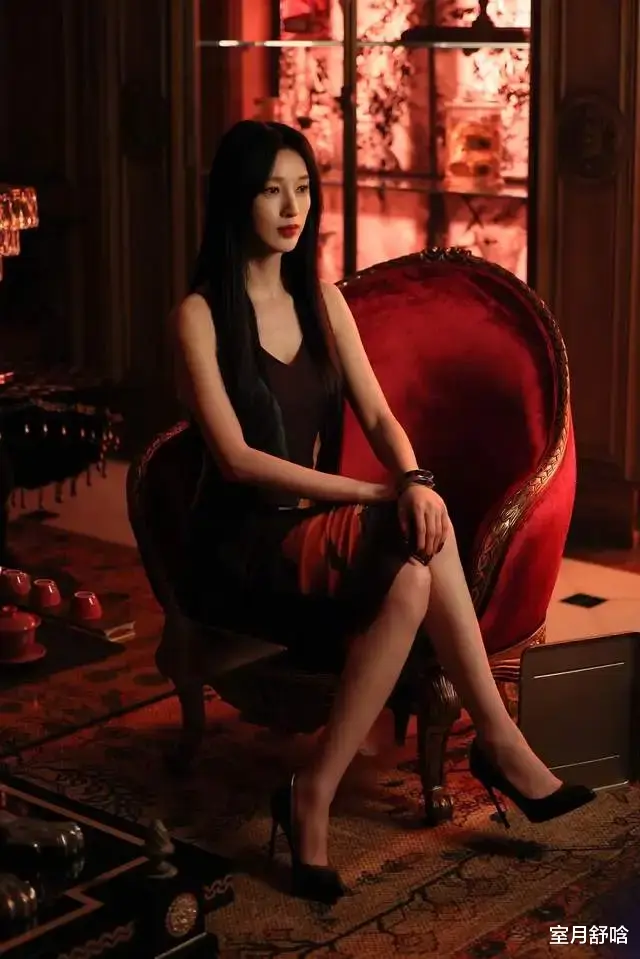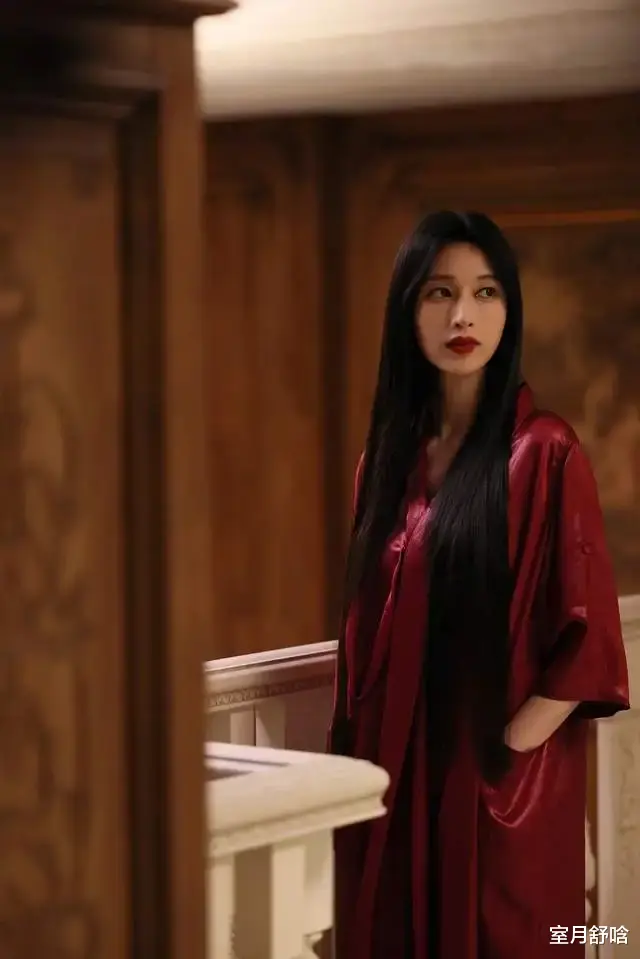 有个镜头给到地面,地面上流着鲜红的液体,一眼望去像人类的血液。随着镜头,从地上的碎玻璃到高跟鞋再到美艳的大长腿,镜头很自然地落到了张俪的手上,她手里拿着破碎的红酒杯子,杯子里还有少许红酒,再去观察她的样子,半垂眼睫的蛇系眼神,毫无表情的脸庞,一下子让观众看到一个“高定黑暗风”的反派美学。