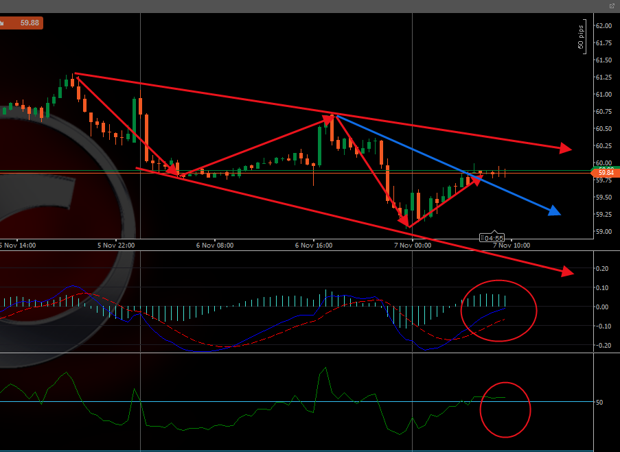 从图表形态观察,昨夜连续两根大阴柱将油价打压至60美元下方,随后在低位形成看涨吞没反转信号,推动原油反弹至59.9美元附近。目前价格正以十字星形态进行横盘整理,显示多空双方处于胶着状态。