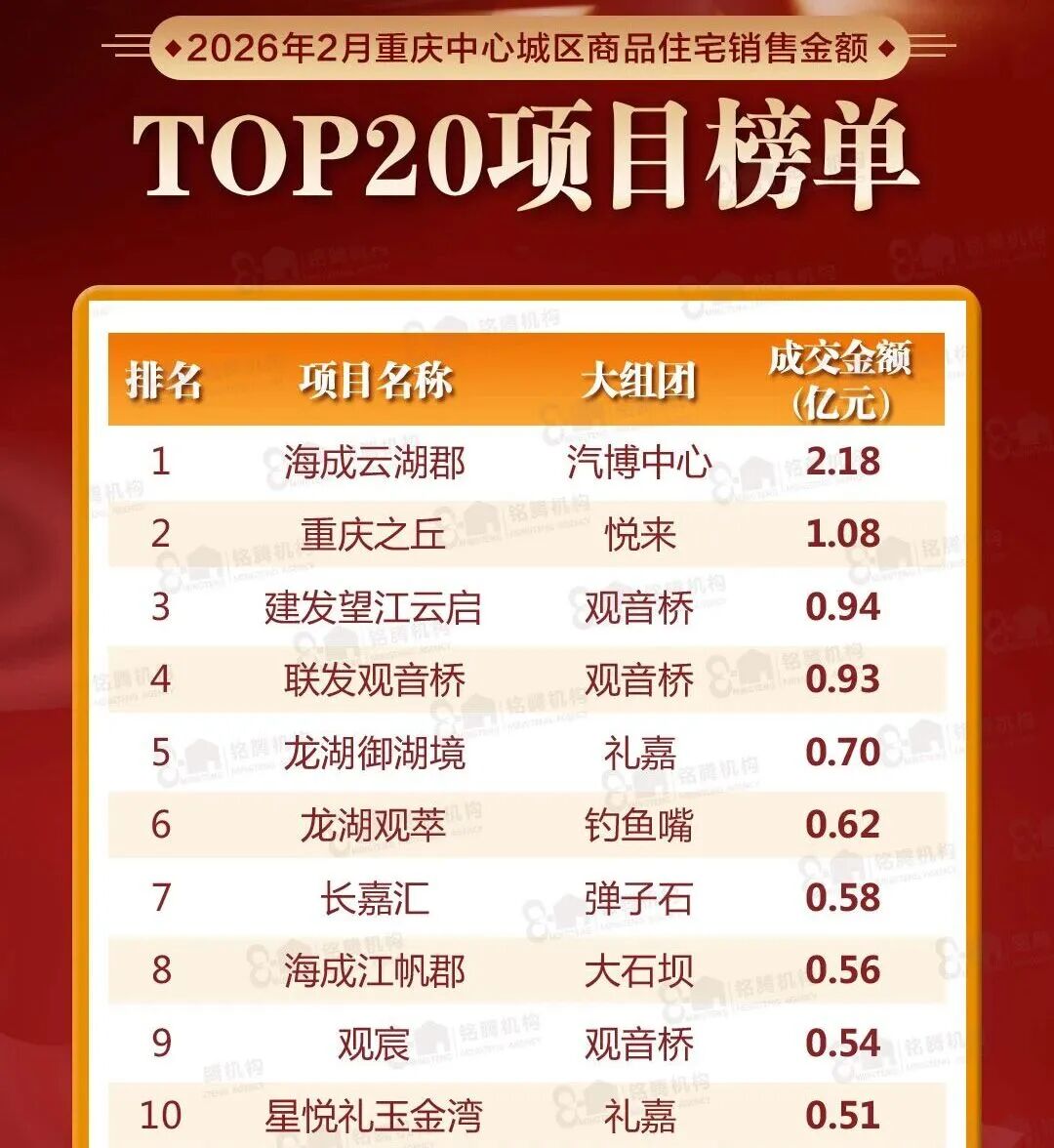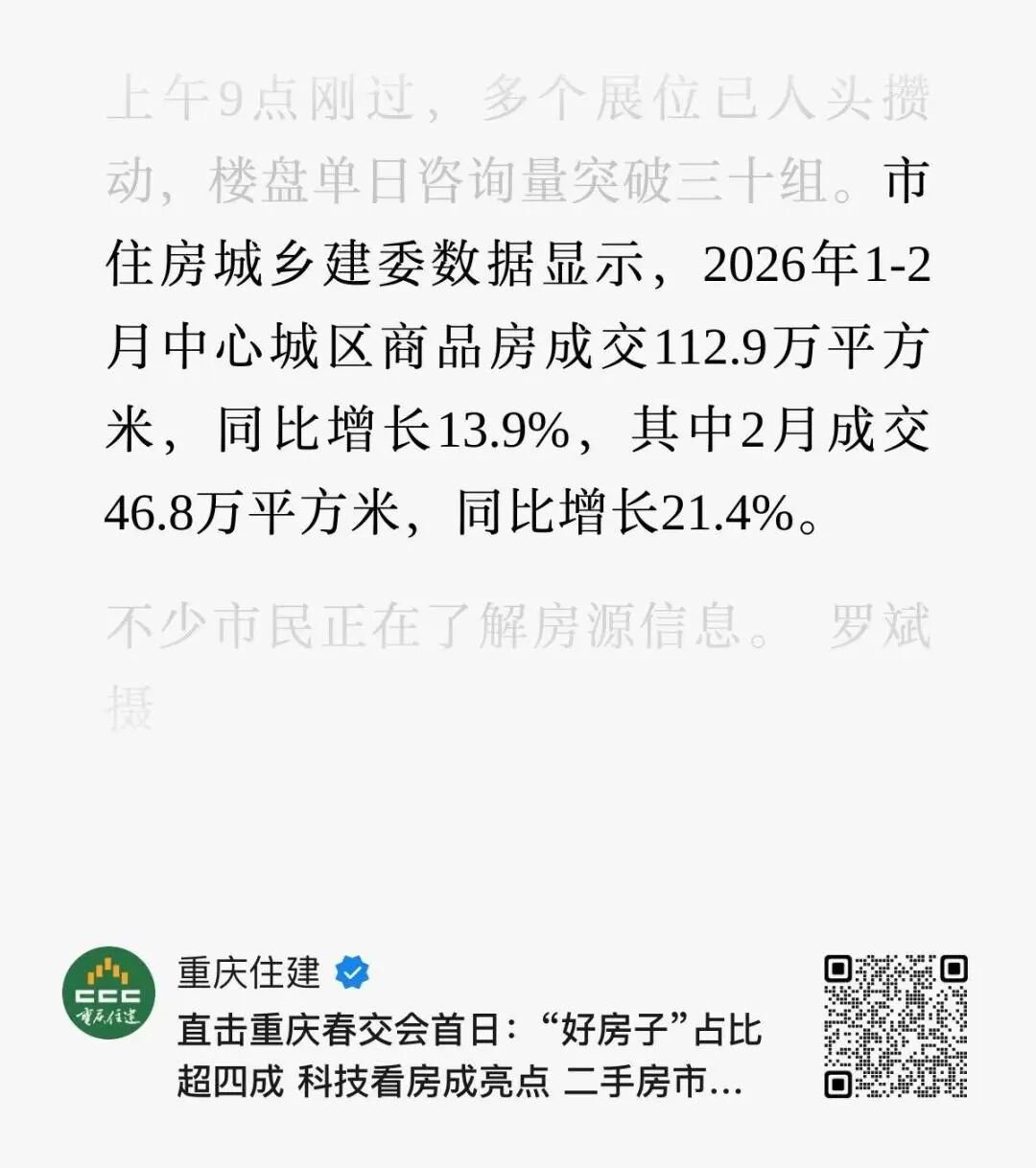 根据官方发布的数据,2026年1-2月重庆中心城区商品房成交112.9万平方米,同比增长13.9%。