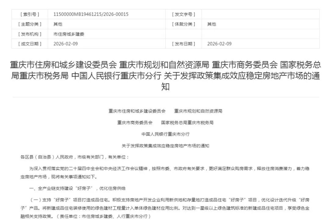 而重庆在2月9日也发布了稳楼市22条新政,从供给端到需求端全链条发力。