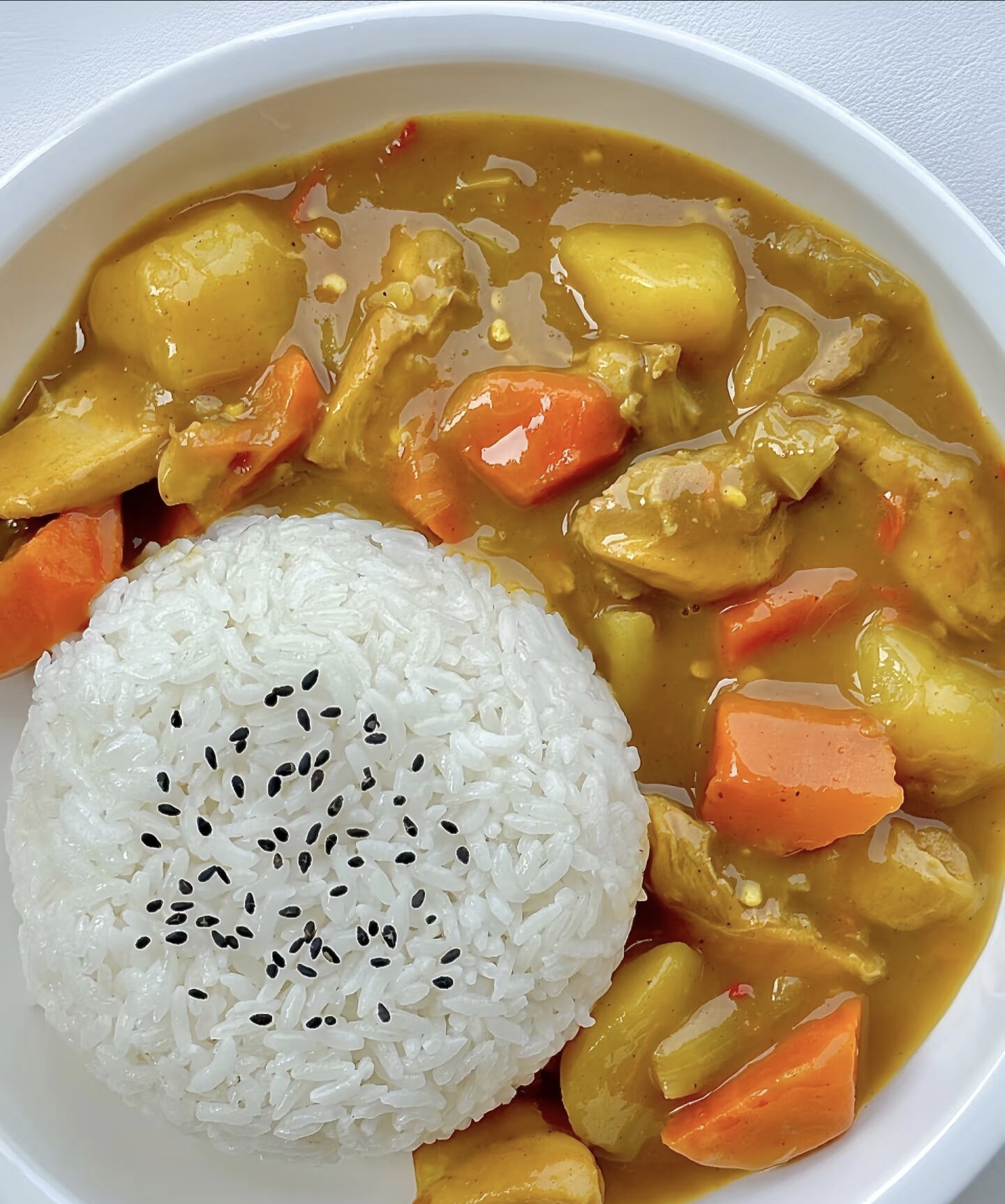 最后,尝一下味道,根据个人口味加点盐或者糖调整一下咸淡,就可以出锅了。盛上一碗粒粒分明、热气腾腾的白米饭,把煮得软烂入味的鸡肉、吸饱了咖喱精华的土豆和胡萝卜,连同那金黄诱人、浓得化不开的汤汁一起,满满地浇在米饭上。用勺子轻轻一拌,让每一粒米饭都均匀地裹上咖喱的香气,迫不及待地挖一勺送进嘴里。鸡肉嫩滑,土豆绵软,胡萝卜清甜,咖喱的浓郁辛香在舌尖上层层铺开,咸中带甜,香而不辣,那种滋味,真的会让人一口接一口,连盘子都想舔干净。