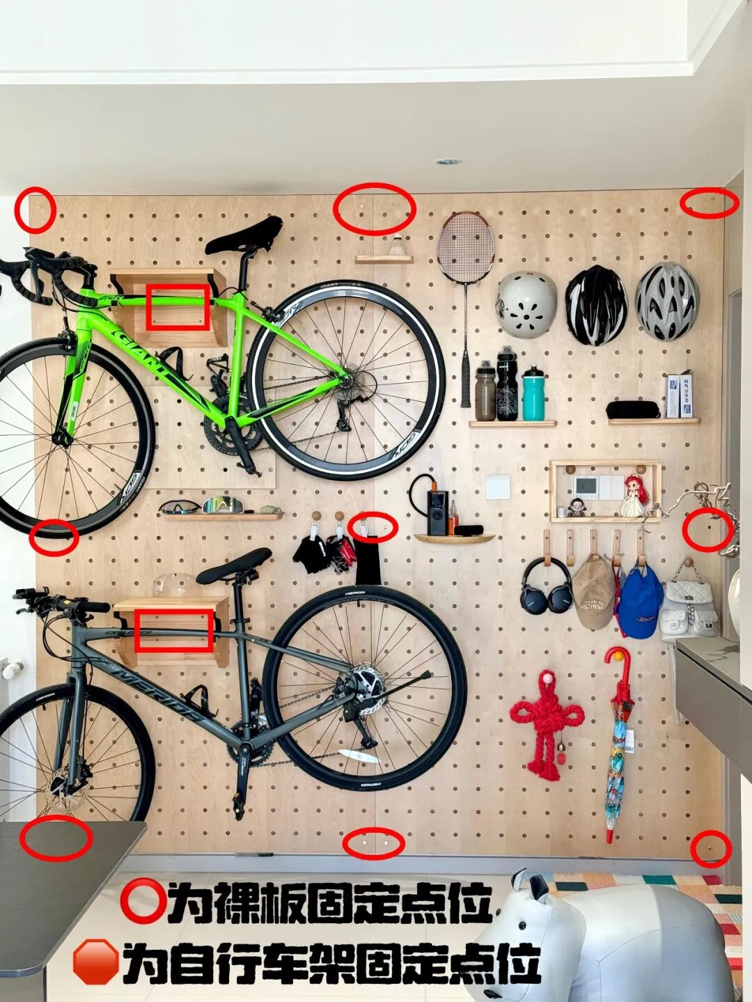 入户墙面定制的洞洞板,打几个螺丝固定上墙后,自行车都可以挂上面。两辆车大概23kg挂在一块板上也很牢固。自选挂钩配件隔板+木棍,还可以收纳各种装备。