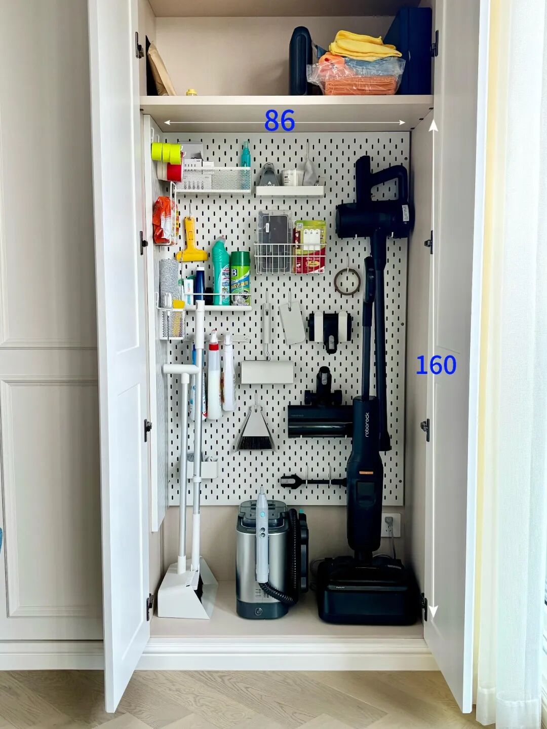 在家政柜里面定制了一块洞洞板,预留了插座,给手持洗地机一个家,洞洞板还能收纳各种清洁物品和工具。