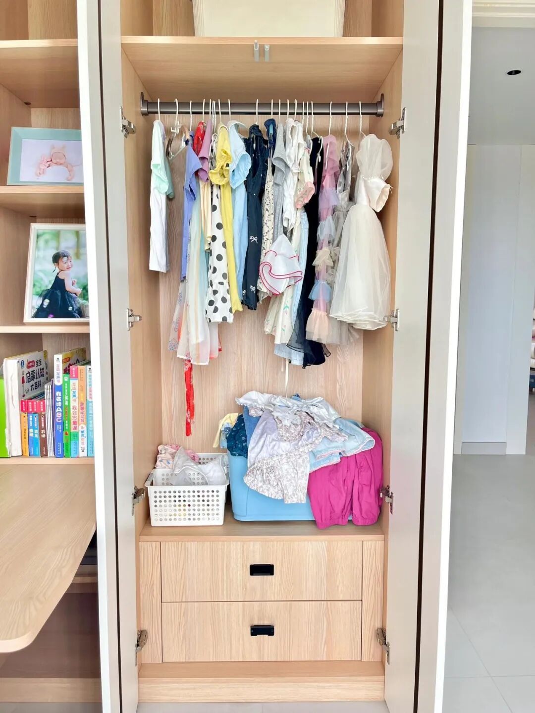宝宝的挂衣区下部分太空,浪费空间,买收纳箱装衣服,但是找衣服太麻烦了,一翻又乱了,加个伸缩杆就很实用,直接可以挂两层,还随时可以调整位置。