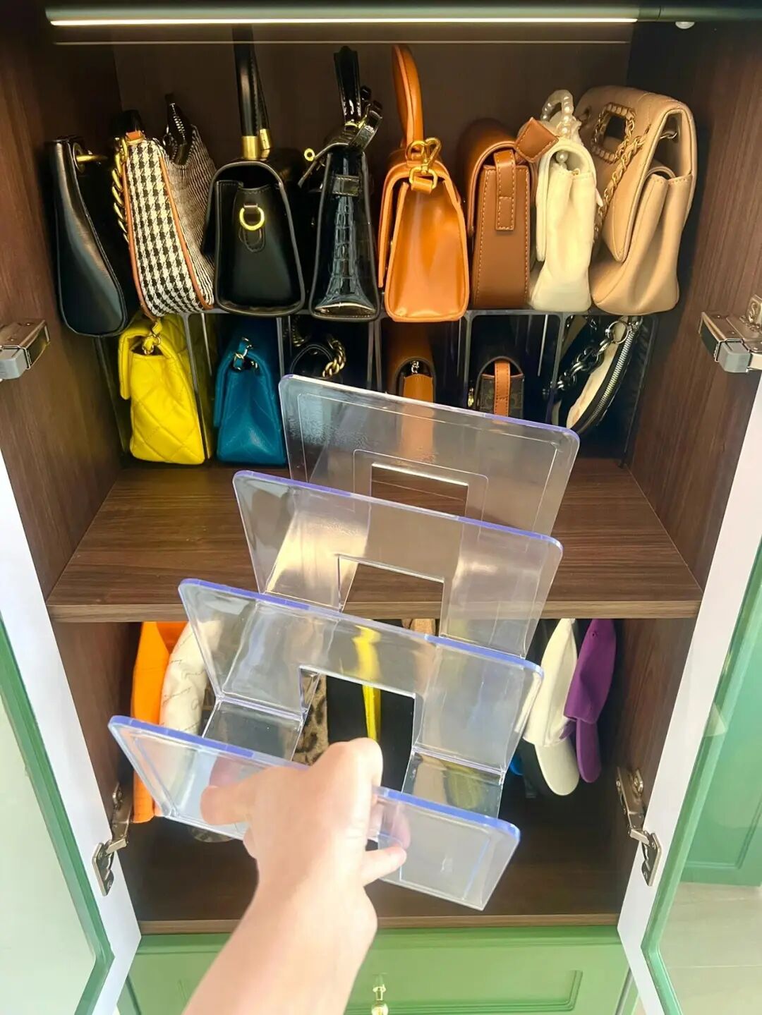 亚克力书立当作包包分隔简直就是绝配,就那么往上一放,真的香,包包也不会东倒西歪,一层秒变两层,而且比那种白色的包包挡板还更加隐形。