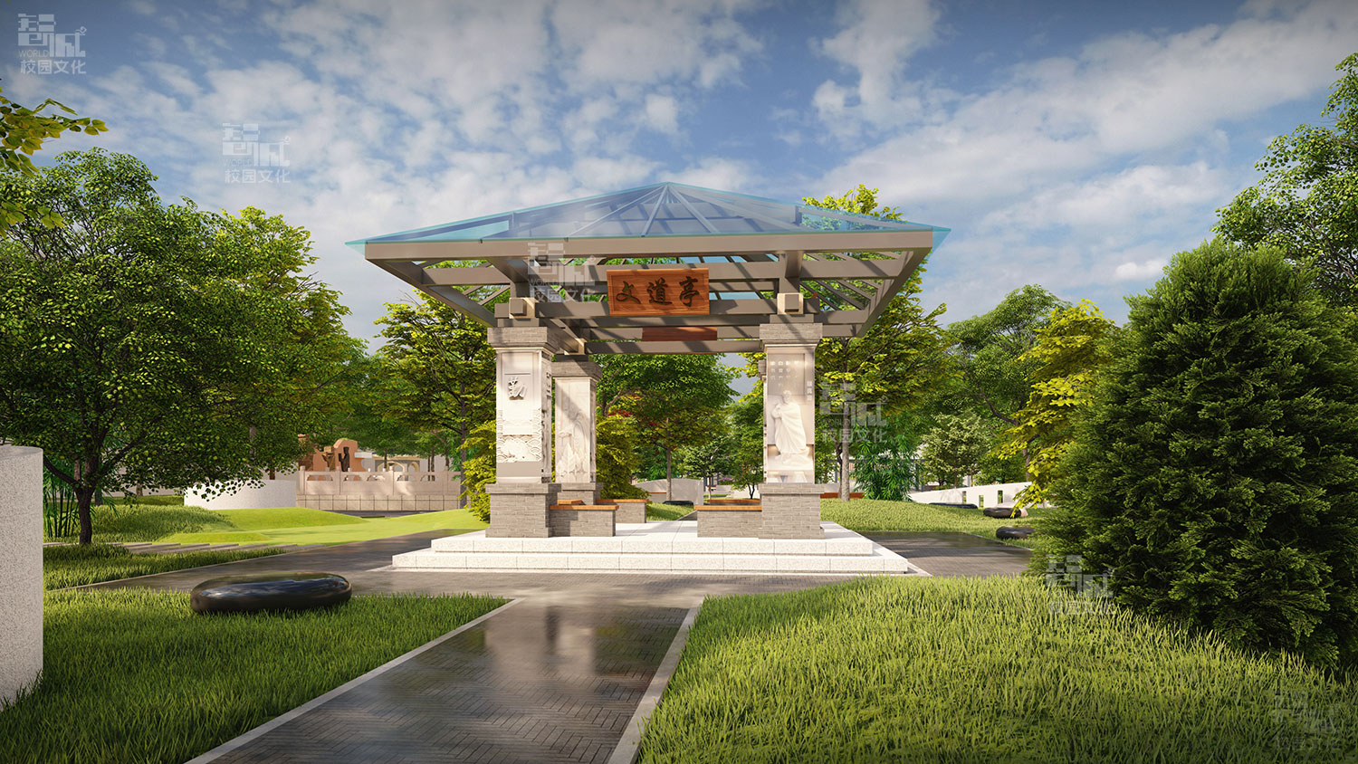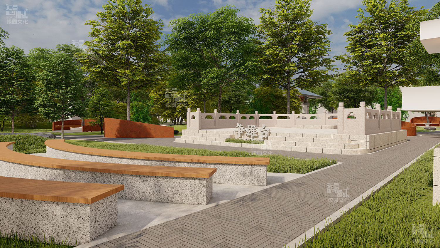 这句话成为改造的起点,我们将原本废弃的石栏平台升级为“争雄台”,其名取自校训“发奋为雄”,并在相邻处修建“文道亭”,以呼应学校“文道并重”的教育理念。同时,我们将校训“诚朴洁勤、发奋为雄”以立体文字形式嵌入主入口区域,强化校园文化认同。