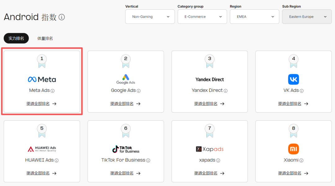 紧随Google Ads之后的Meta Ads,是Android端的另一个“寡头”,该渠道仅在印度次大陆的个人理财品类中表现较弱,除此之外在其他品类和地区优势均十分明显,特别是在东欧电商品类中,更是“打败”了Google Ads成为榜首。