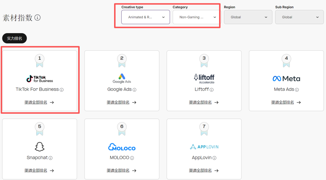 在非游戏应用中,Google Ads(以 YouTube 为主)凭借UGC 类素材的强劲表现位居榜首。Meta Ads 在试玩内容类素材中名列前茅,而TikTok for Business 则在动画+真人混剪类素材中表现出众,值得广告主关注。