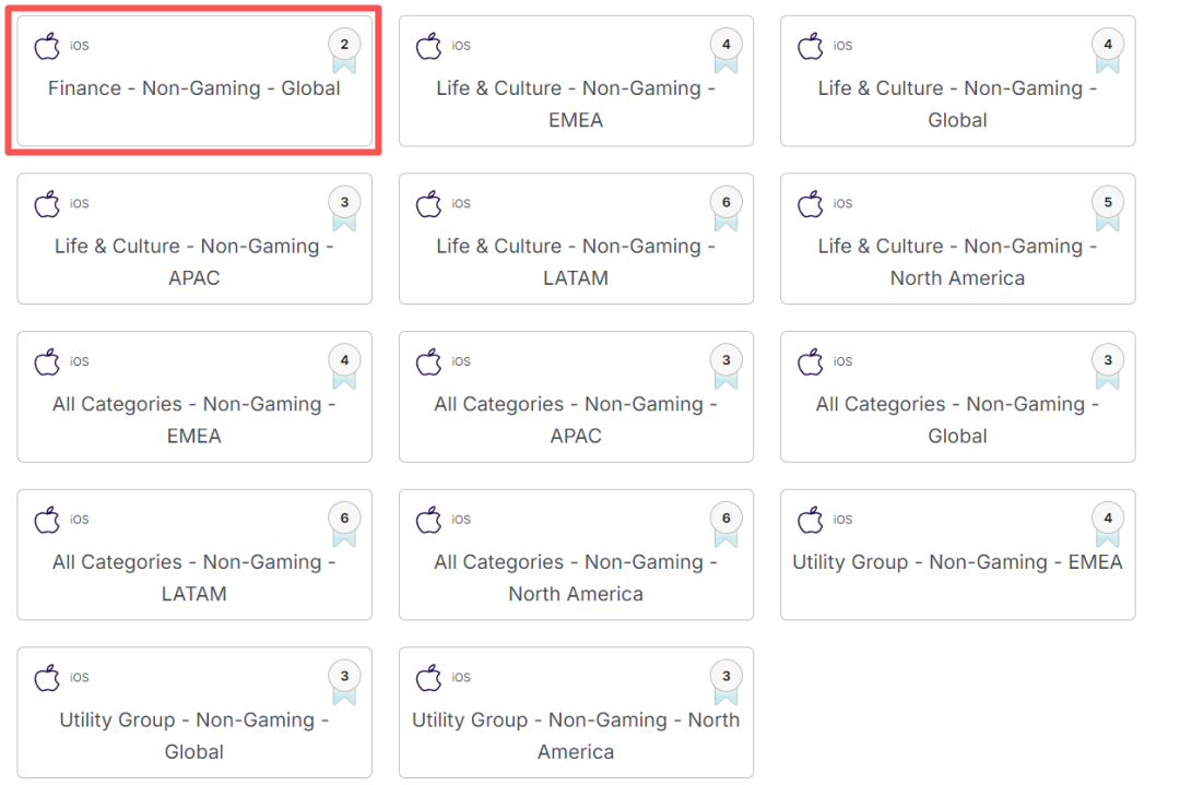 iOS端,Apple Ads仍然是绝对的“王者”,除在澳大利亚和新西兰排名第2之外,在其他所有非游应用品类和地区全球综合实力和体量榜均位列TOP1。