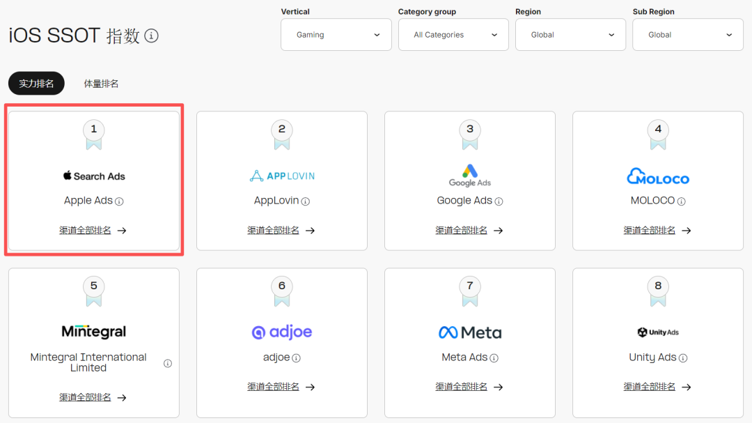 具体到游戏方面,从游戏类应用全球媒体渠道的排名看,Apple Ads依然在iOS端保持着强大的统治力,广告质量遥遥领先,在除超休闲和桌游类之外的所有主要游戏品类中均位列第一,而这种优势在中度游戏赛道表现最为突出。