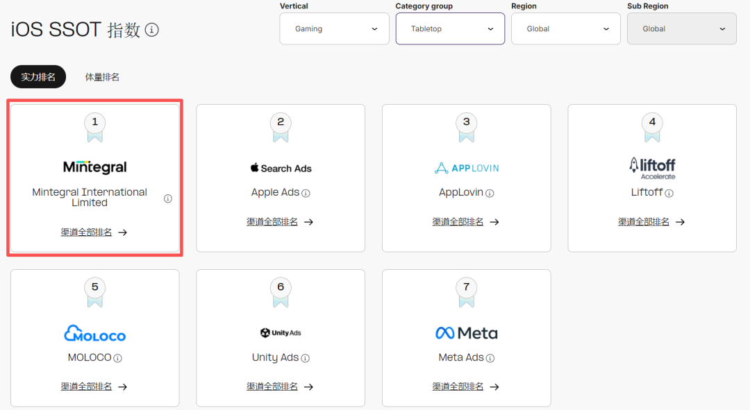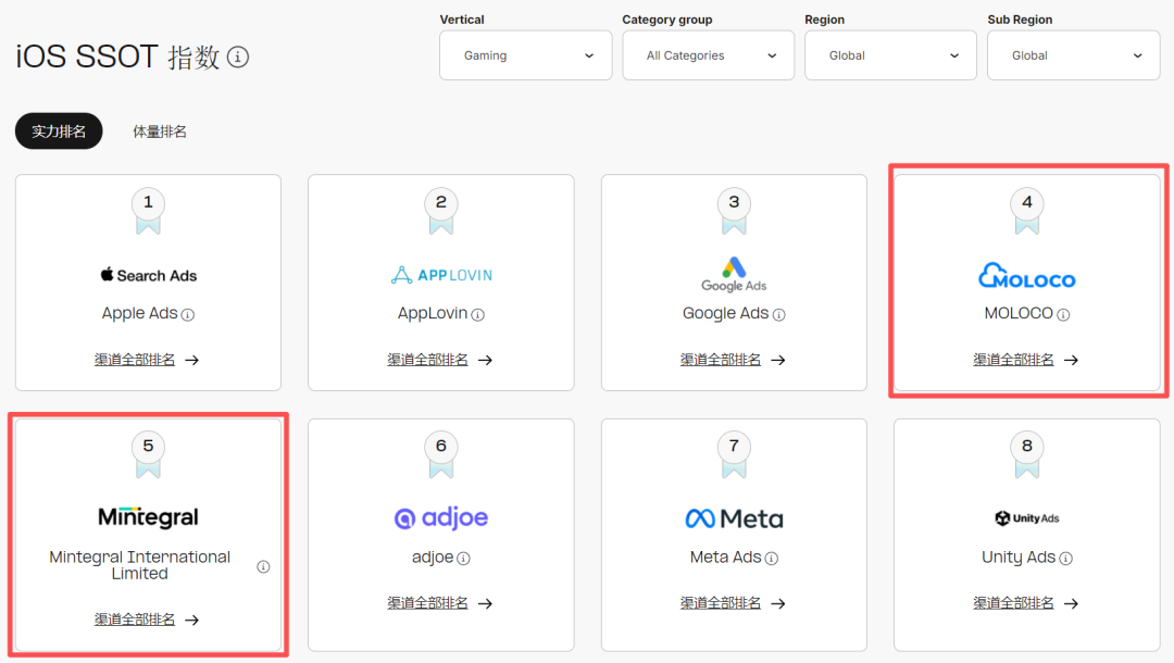 此外,iOS端值得关注的TOP5渠道还有Moloco和Mintegral,二者分列iOS端综合实力榜第4和第5名。