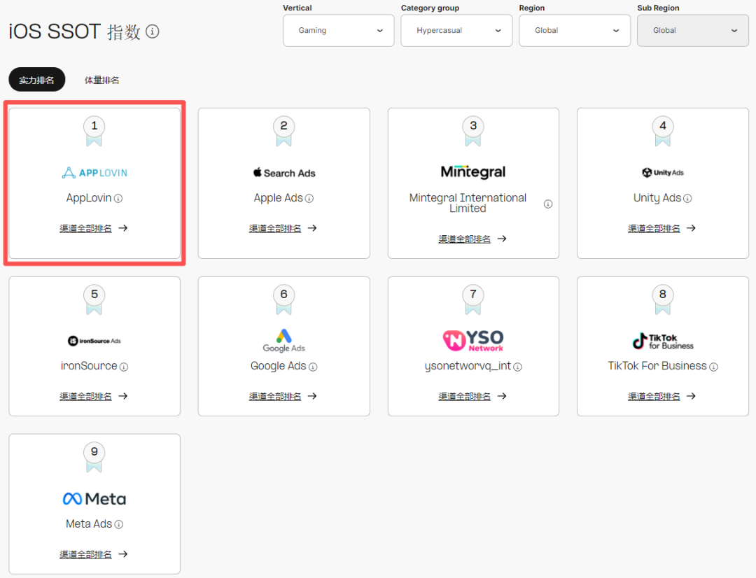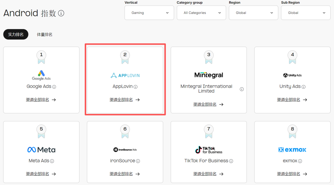和Apple Ads评分优势收窄的情况有所不同。在全球综合实力榜位列第二的AppLovin延续了去年的增长态势,从体量榜第3上升至第2,再度缩小了和Apple Ads的差距,在超休闲游戏品类中位列TOP1,在动作、休闲、博彩、三消、模拟等热门品类中均排名第2。区域方面也和Apple Ads形成了“互补”,在北美、欧洲(包含东欧和西欧)的综合实力和体量榜中均位列TOP1,优势突出。