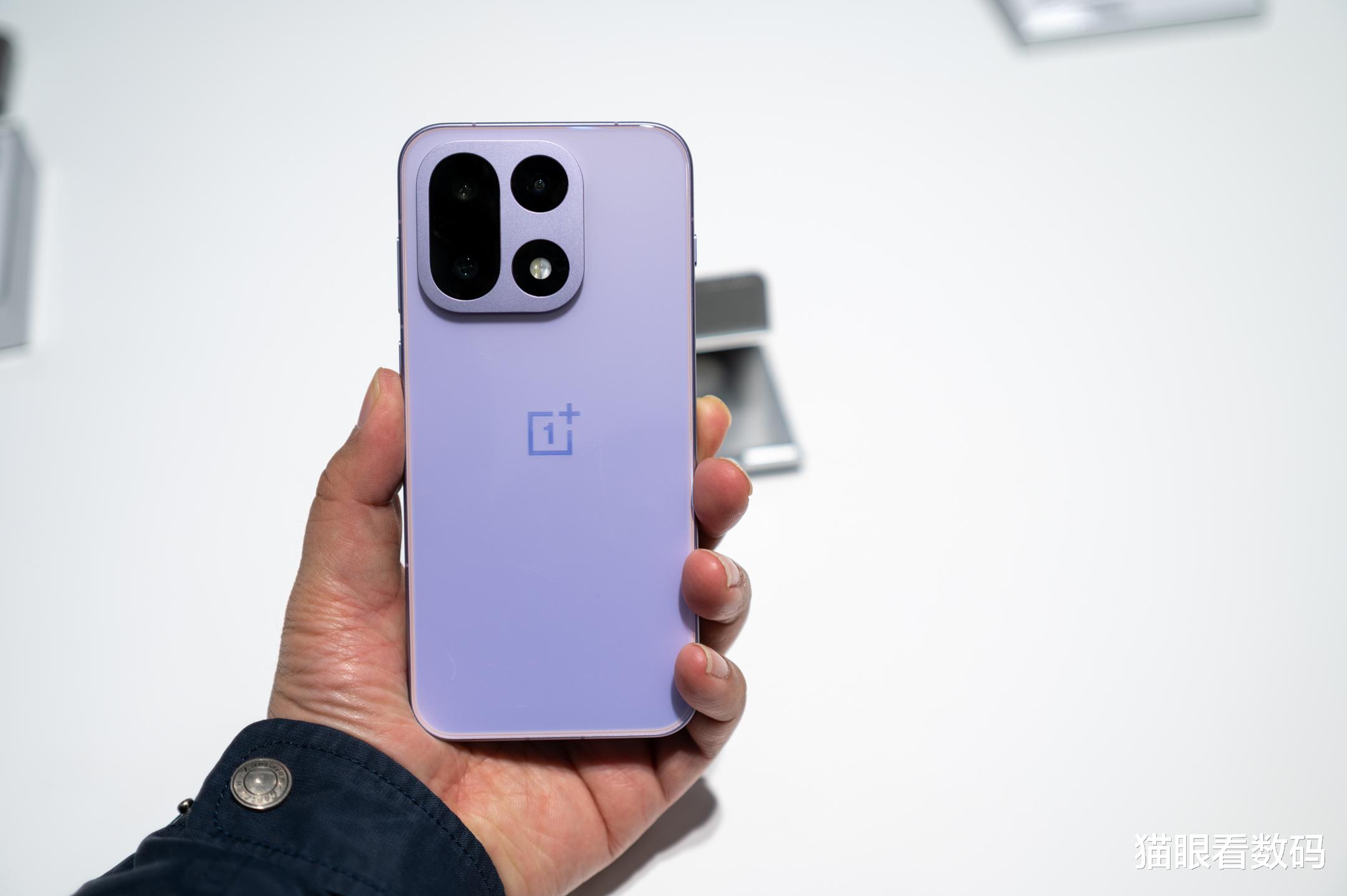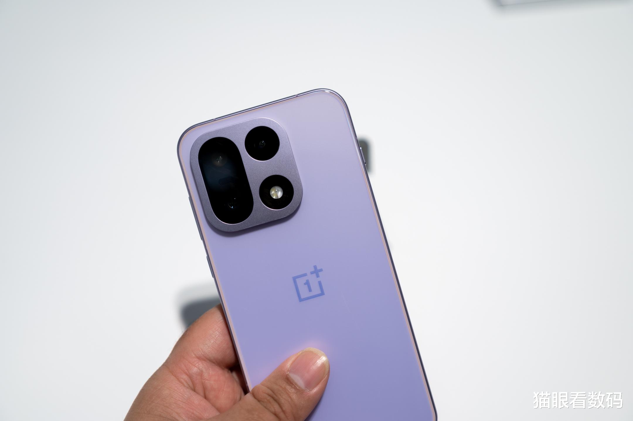 当我第一次把一加15拿到手上,最先感受到的就是它在设计上的思考。官方称之为“沙丘美学”,这种灵感体现在极简的线条和优雅的低饱和度配色上。我们现场体验了“原色沙丘”和“雾光紫”两个版本,前者通过行业首发的原色金属纳米工艺,呈现出一种温润的金属质感;后者则采用了全新单层双维流光工艺,触感细腻,一眼惊艳。