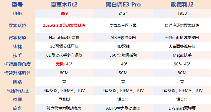 从承重和耐用性来看,夏草木Fit2领先,认证齐全、设计寿命长且抗衰减表现优异;黑白调E3 Pro和歌德利J2耐用性差不多,适合日常办公和家用,但极限承重和长期稳定性略逊一筹。