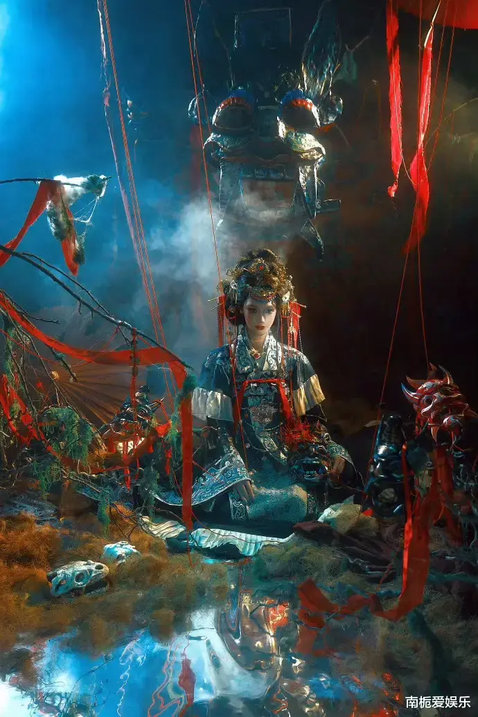 照片中,她头戴鎏金傩面,额间一点朱砂,身披赤红丝线织就的嫁衣,宛如从古老祭祀仪式中走出的神女。这组造型以贵州传统傩戏面具为原型,在保留其驱邪纳吉的原始野性基础上,巧妙简化繁复纹路,融入现代审美语言,将非遗文化与时尚艺术完美融合,令人耳目一新。