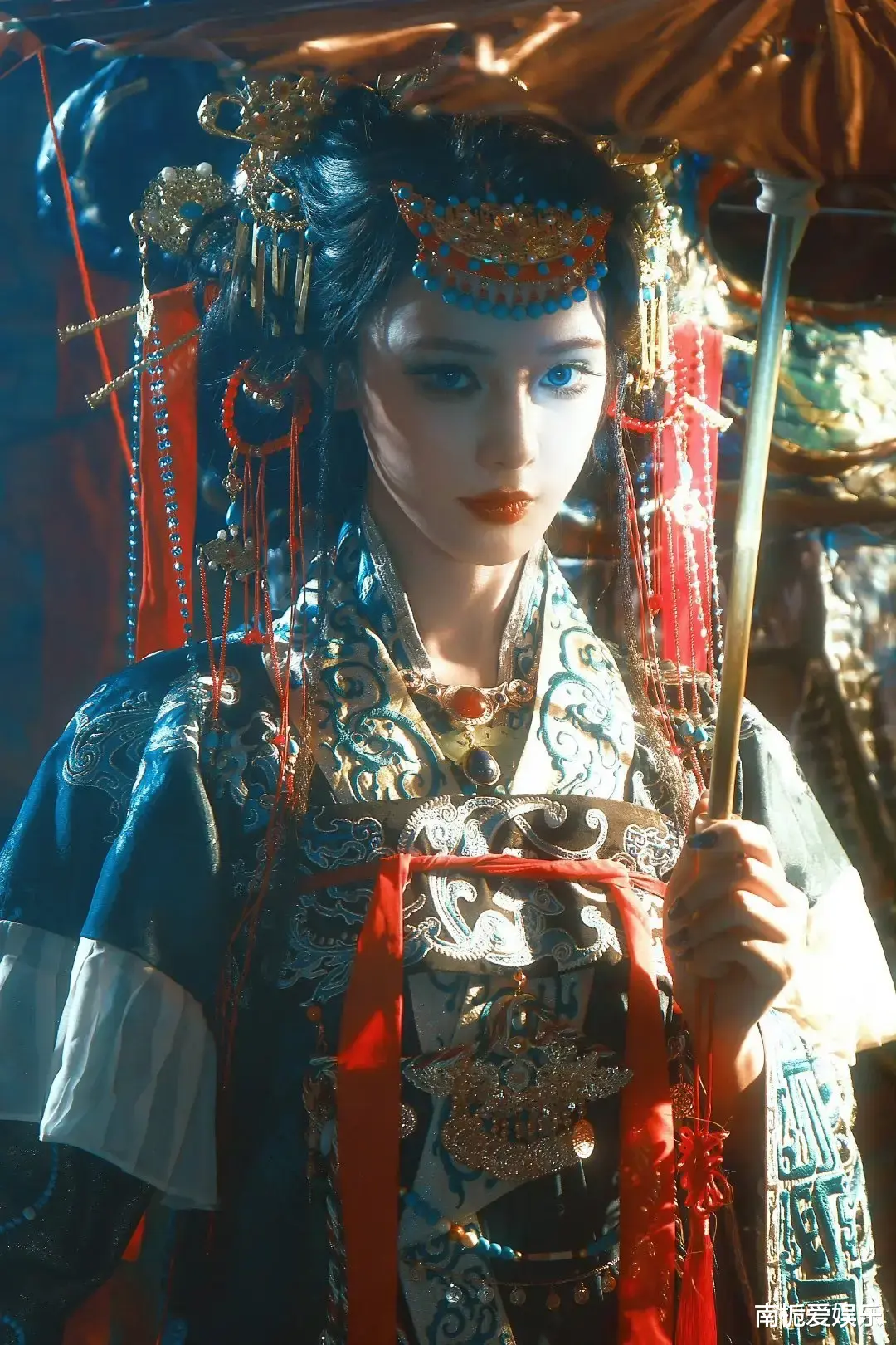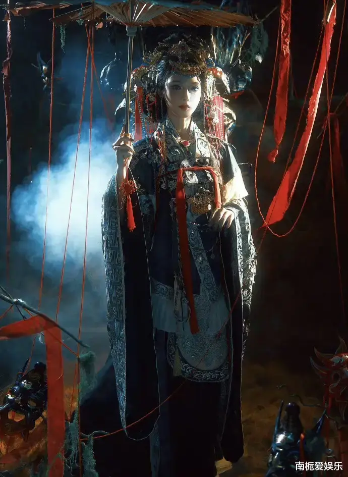 创作背后,团队曾深入贵州山区采风,拜访非遗传承人与面具雕刻匠人,细致研究傩戏的历史渊源。每一处细节都经过精心打磨:重达三斤的银冠由手工錾刻而成,流苏垂坠间尽显庄重;眼尾点缀细闪,强化“悲悯与洞穿人心”的双重情绪;可拆卸面纱既保留神秘感,又不遮挡她那双极具叙事张力的眼睛。赭红与鎏金为主色调,衬托出她冷白的肌肤与浓颜五官,金属的硬朗与纱绸的柔美形成强烈对比,构建出“神性肃穆”与“诡魅张力”并存的独特美学场域。