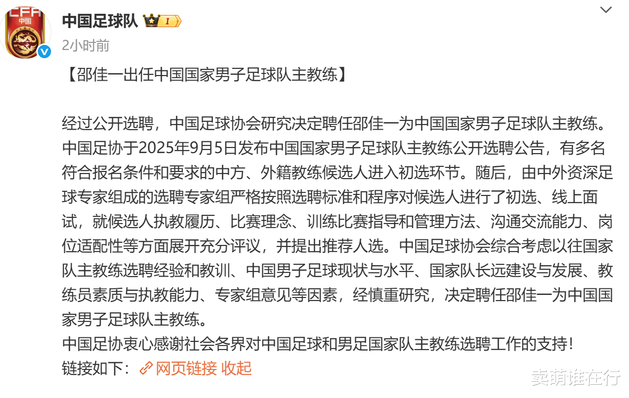 所以即便足协在聘请邵佳一的公告中,做出了“有多名符合报名条件和要求的中方、外籍教练候选人进入初选环节。随后,由中外资深足球专家组成的选聘专家组严格按照选聘标准和程序对候选人进行了初选、线上面试,就候选人执教履历、比赛理念、训练比赛指导和管理方法、沟通交流能力、岗位适配性等方面展开充分评议,并提出推荐人选。中国足球协会综合考虑以往国家队主教练选聘经验和教训、中国男子足球现状与水平、国家队长远建设与发展、教练员素质与执教能力、专家组意见等因素,经慎重研究,决定聘任邵佳一为中国国家男子足球队主教练”的解释。但是很显然足协的解释,依旧掩盖不了,邵佳一根本不符合选帅标注这一点时,大家也都很清楚,即便对于选则邵佳一进行强行解释会打自己脸,还不得不做解释的足协,对于国足选帅根本就说了不算。