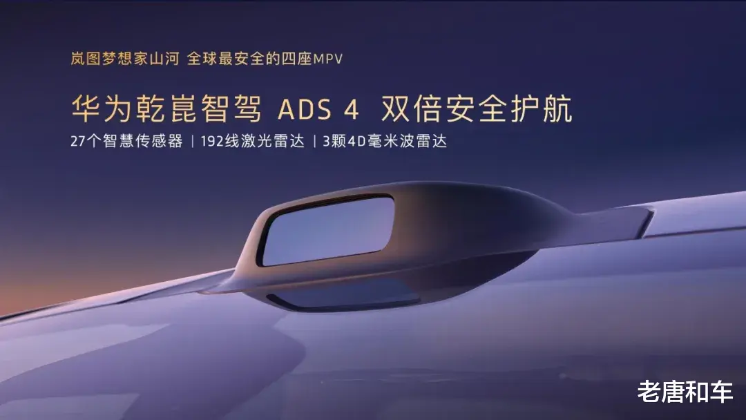 新车搭载华为乾崑智驾ADS 4系统,硬件、架构和算法全面升级,配备27个智慧传感器、192线激光雷达及3颗4D毫米波雷达,拥有21项智能安全辅助功能,能应对极端天气和各类突发路况,已为用户避免超4万次可能的碰撞风险。车身采用 2000MPa铝硅涂层车门防撞梁、一体式热成型激光拼焊门环及超高强度笼式车身,搭配岚图自研的琥珀电池2.0,通过6倍国标托底冲击测试。隐私安全与健康安全同样兼顾,全隔断智能云幕、自动隐私帘与密码保险箱保障隐私,母婴级亲肤面料和负离子空气管理系统守护健康。