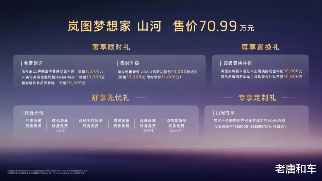此次推出的岚图梦想家山河,聚焦新时代行业领军者、企业家等高净值人群需求,将智能安全、舒适私享与中式美学深度融合,旨在成为商务精英的 “移动空间”。设计层面,新车融入中式美学理念,提供皓月紫云、拂晓金晖两款专属双色车身,搭配20英寸高定星漩轮毂与悬浮徽标。车内采用天然影木镶嵌装饰,搭配66处鎏金饰件,寓意吉祥。座舱内首创 “山河云榻” 模式,中岛式电动鞋履仓与166° 躺角零重力座椅衔接形成超2米舒享大床,脚托加热、按摩与通风功能提升舒适度。同时配备50寸 IMAX 巨幕、22扬声器丹拿音响、主副双冷暖箱及隐藏式高定雨伞等配置,兼顾办公与休闲需求。