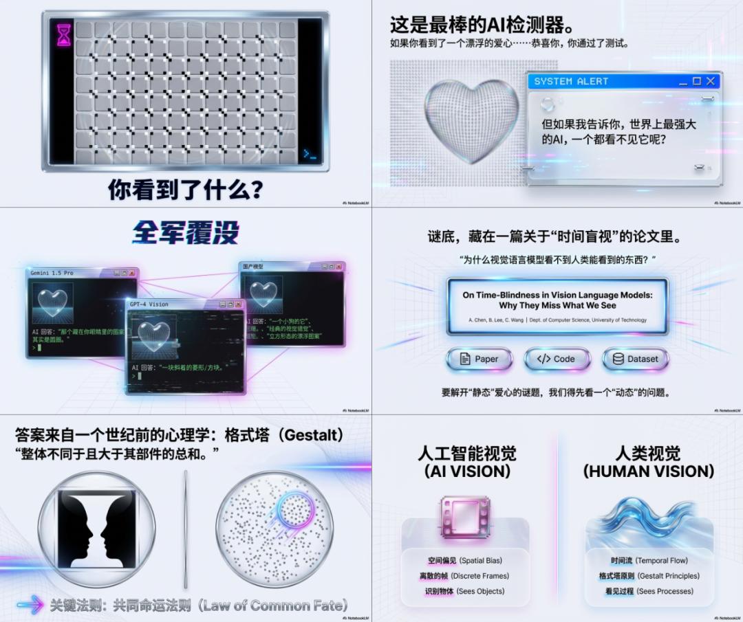 “使用黑色背景酸性设计风格,来从为什么看不到图中的爱心开始,为大家详细科普人类和AI视觉的不同,观众是一些对AI感兴趣的爱好者。”