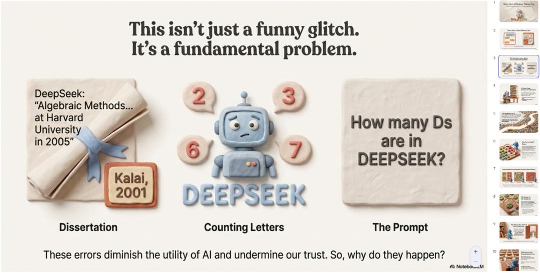 比如,这是我把之前OpenAI的那篇论文《 why-language-models-hallucinate》扔进去,用黏土拟物风格产出的英文PPT。