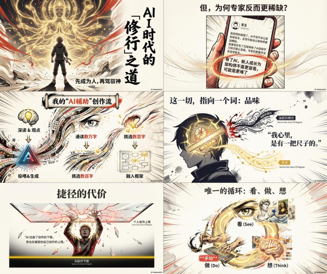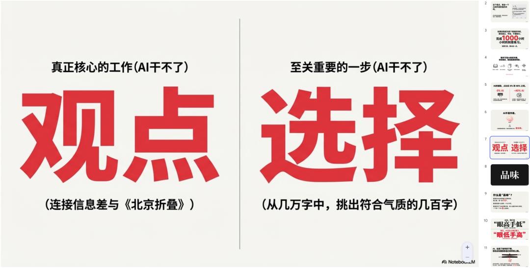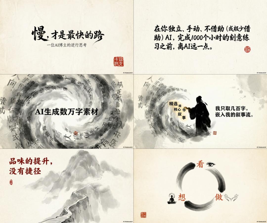 而这一切的一切,都只是我把要转PPT的原始素材,扔了了NotebookLM,然后 NotebookLM在拆解之后,调用Nano Banana Pro生成的。